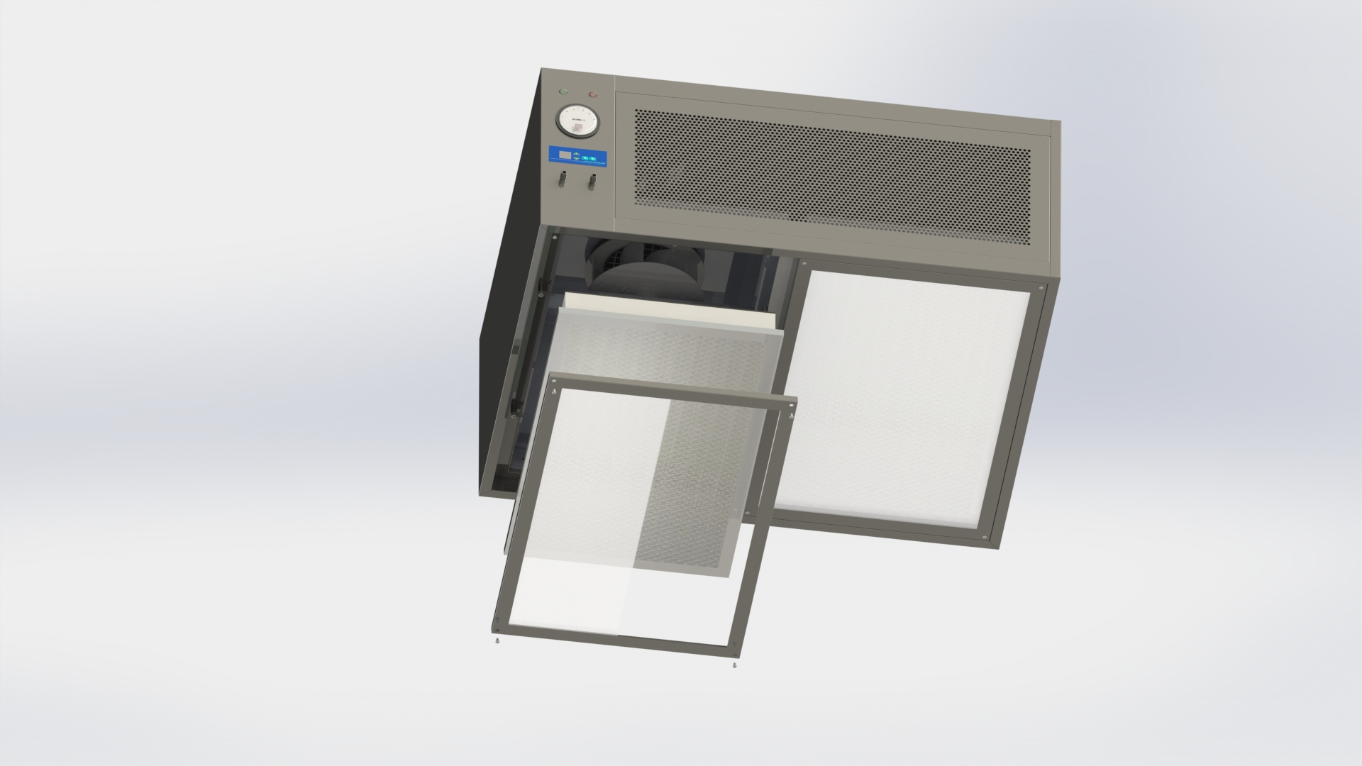 4、安裝時,要將高效過濾器時的箱體抬起,然后將原本失去效果的高效過濾器取出,換上新的高效過濾器,檢查確保四處的邊框密封后,將箱蓋回原位;